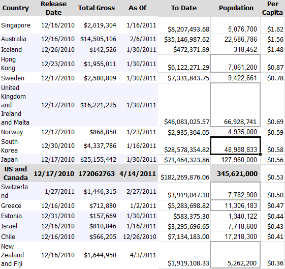 This table is based on gross receipts reported for Tron: Legacy by country since it was released and then trended for today's date. Then I took the population to get a per-capita expenditure and you can see that in countries like Singapore and Australia the movie had an appeal to a much higher percentage of the population. If I had ticket prices I could tell you how many people actually saw the movie!